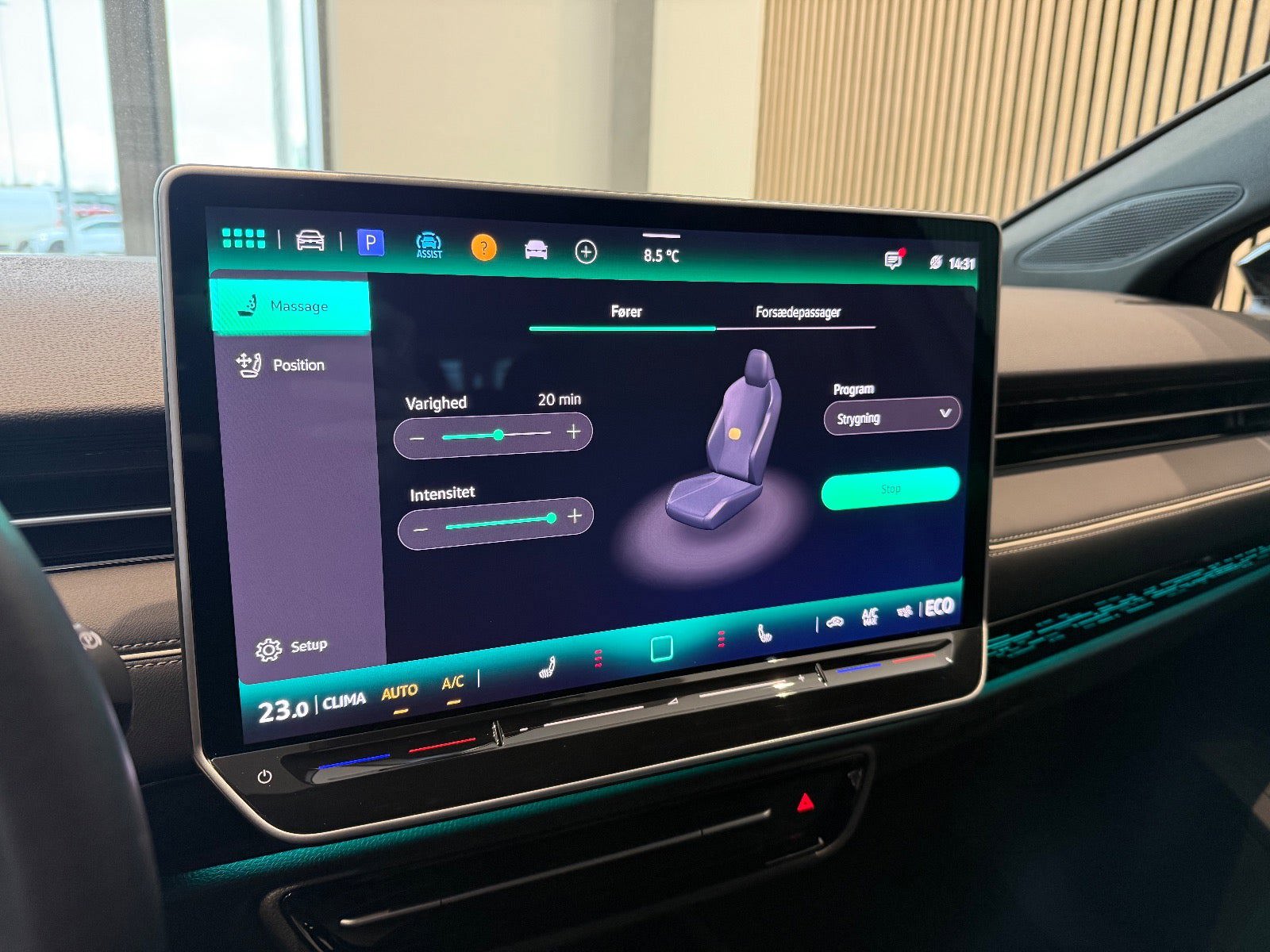 Varmepumpe, 3-zonet klimaanlæg, opvarmet forrude, sædevarme og massage giver høj komfort året rundt. Sammen med avancerede førerassistenter og Head Up Display er ID.7 Tourer både afslappende og sikker at køre.